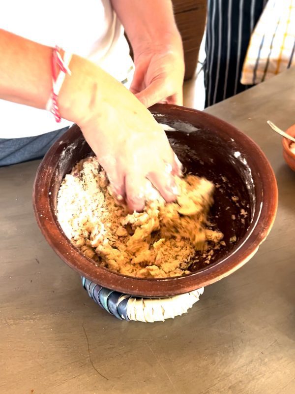 - Cup your hand above the flour mix and pour some of the water in. Dribble the water over the flour and gently mix with your fingers until it is a smooth dough.