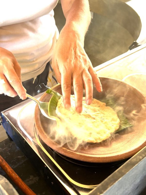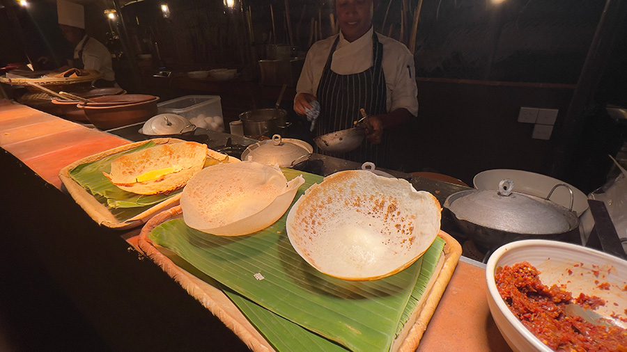 The batter is swirled around the sides of a small wok. It creates a kind of pancake bowl. Plain hoppers are served without any additional ingredients. Egg hoppers have an egg dropped into the ‘bowl’ during the cooking.