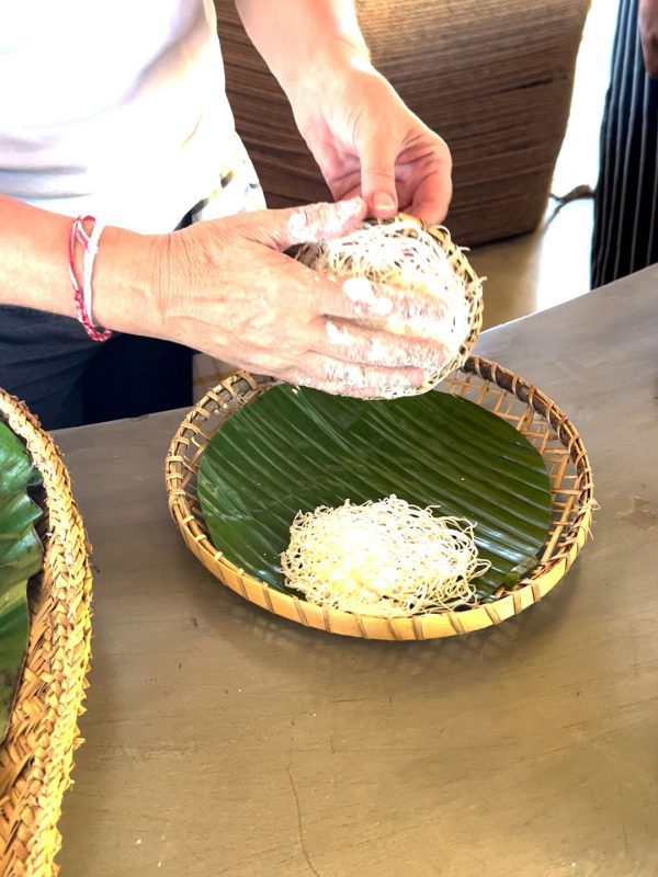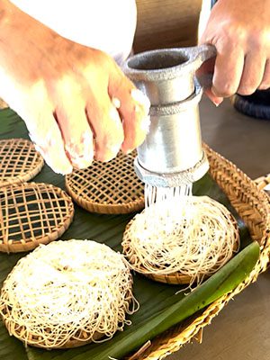 String hoppers are made with rice flour mixed with salt and water. The dough is then put into a string hopper press and swirled onto bamboo moulds and steamed.