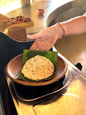 - If you are lucky enough to have banana leaves, press the balls out using your hands until they are flat and about the size of a small side plate. Alternatively, you can roll them on a board with your hand or a very lightly dusted rolling pin.