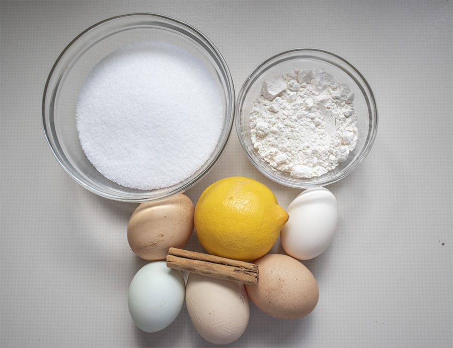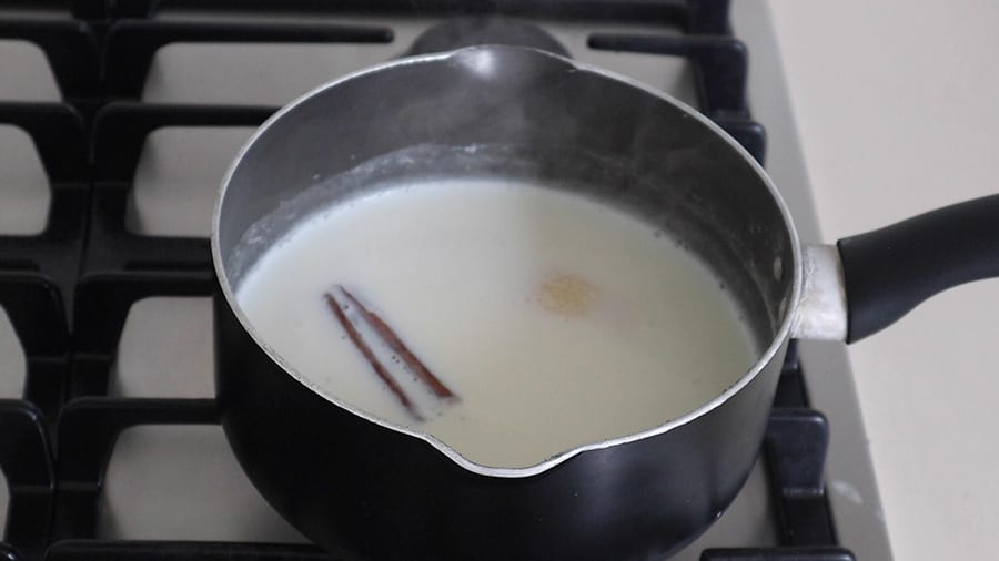 Put the milk and the lemon rind (no pith) and cinnamon stick into a pan and bring it up to a boil. When the milk starts to boil, turn the heat down low and add the flour and sugar mix, while still stirring to combine the ingredients. Turn the heat to medium heat and let the mixture thicken until you can draw a visible line with your spoon from side to side and leave a trail.
