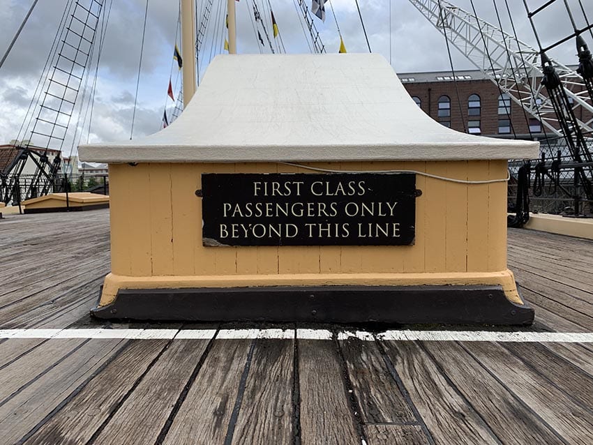 The upper deck looks similar to how it was in when the SS Great Britain first launched. The areas for second and third-class passengers are the first-class passengers had their reserved area marked by a white painted line on the deck.