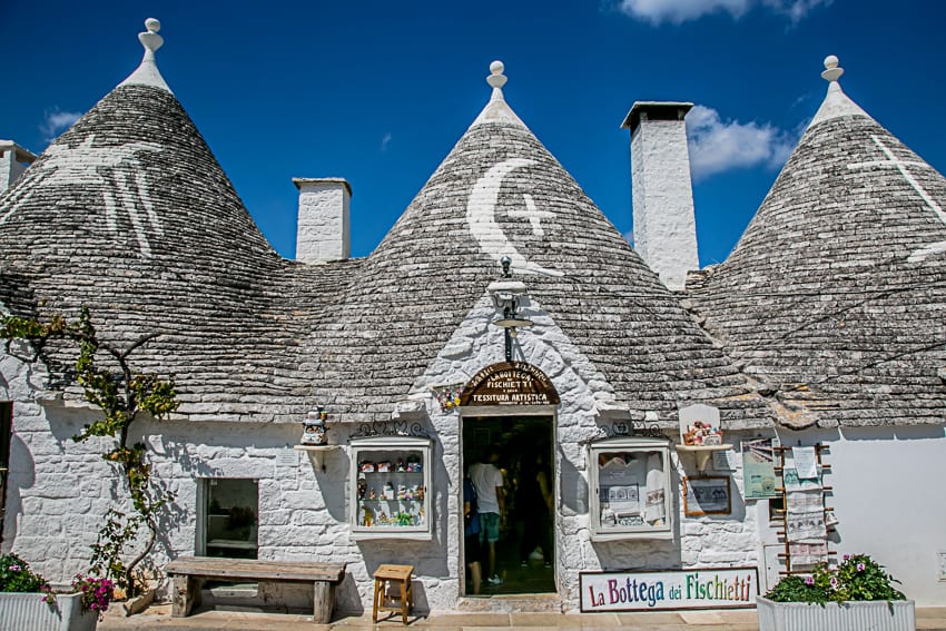 Trullis are easily identified with their white dry stone bases and pointy conical roofs and for having no windows. You can’t miss them if you try. These fairy tale homes are best observed by paying a visit to the UNESCO protected town of Alberobello.