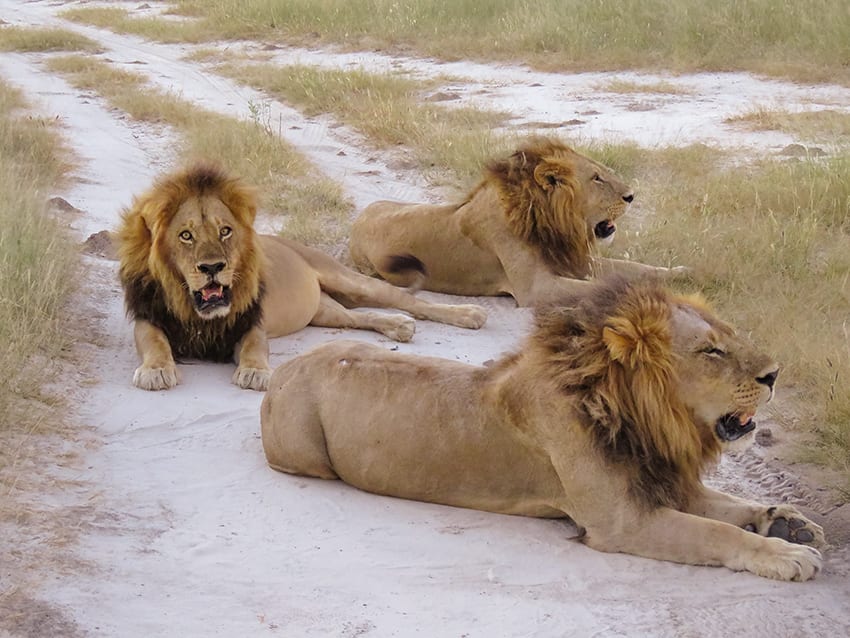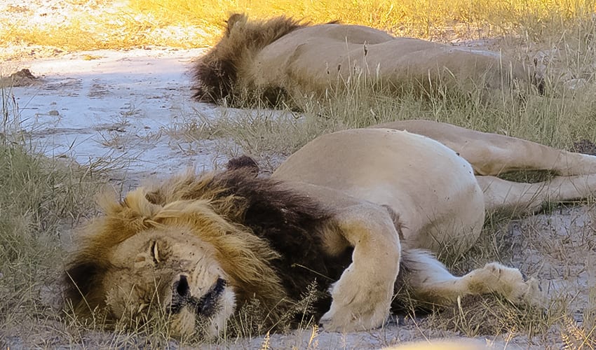 The radio crackled into life. There had been as sighting – lions! Three male lions had been spotted resting after a kill. We set off to find them, Lake and Moss scanning the ground for footprints.