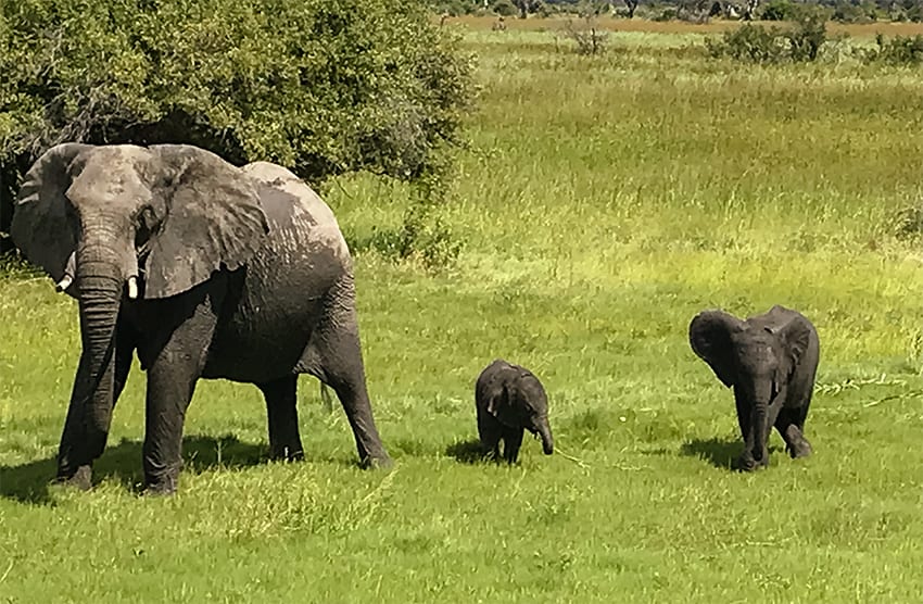 Landing smoothly on the grassy landing strip we saw a couple of jackals slopping off, before lying down to wait for us to disembark. Our guide, Moss and our spotter, Lake were waiting for us in the Land Cruiser. With introductions given and bags loaded, we drove off and within minutes I was well and truly gobsmacked as we came face to face with a herd of elephants.