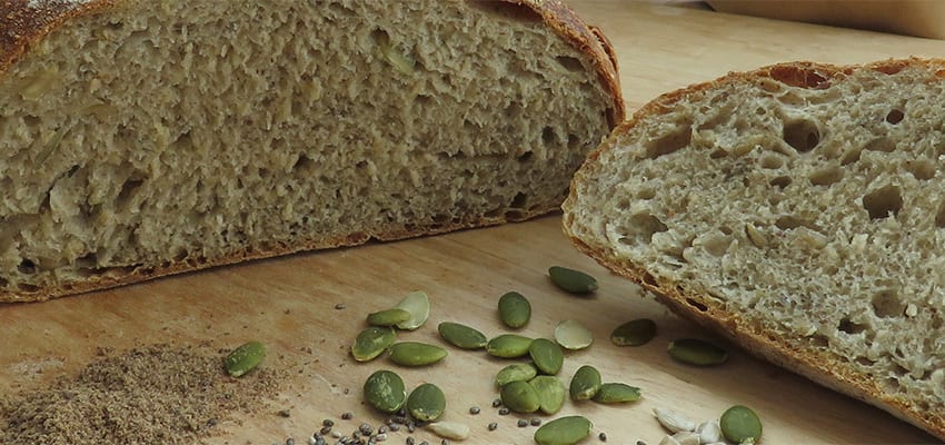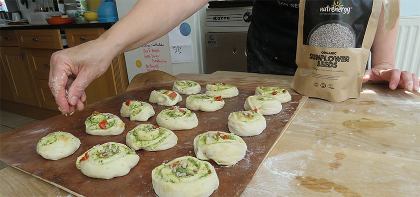 Coffee drunk, and the now mixed dough popped in a clean, lightly oiled bowl and topped with a damp tea towel to prove, it was on to our next masterpiece. The dough, a multiseed mix with Nutrenergy organic pumpkin, chia, sunflower and flax seeds, had already had its first prove, but it needed to be knocked back.