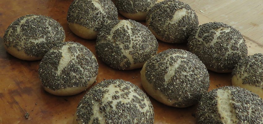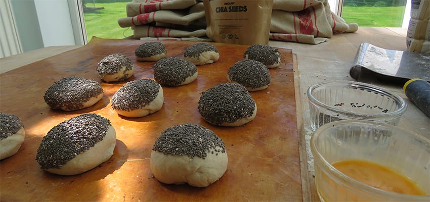 We were definitely on a roll now – sorry a bad bread-making pun – and back to our original White-ish dough. After measuring out the dough into 12 equal balls, I then shaped them by hand, by gently rolling them in on themselves. A brush of egg wash was followed by a dunk in Nutrenergy organic chia seeds and they were ready to pop in the oven.