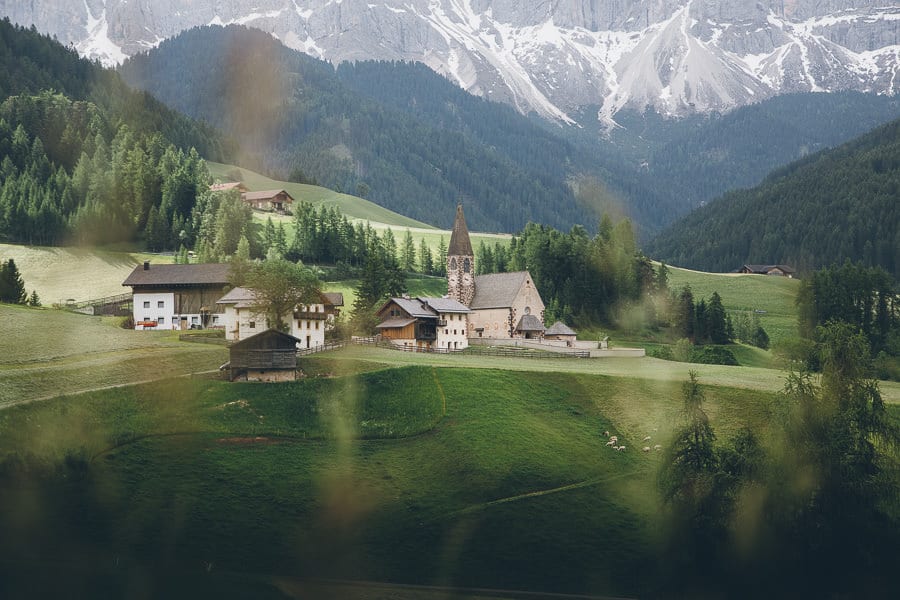 Nestled in rolling green meadows under the jagged spires of the Puez-Odle massif, Val di Funes is a scenic and refreshing weekend in Italy. The less-photographed Santa Maddalena is a traditional light grey stone church nestled among the green pastures of the Obermesnerhof Farmstead.