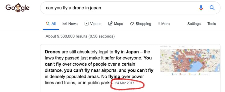As you can see from the above example taken on 1 February 2020, the top result for flying your drone in Japan is nearly 3 years out of date. So if you follow their advice, you might get yourself into trouble.