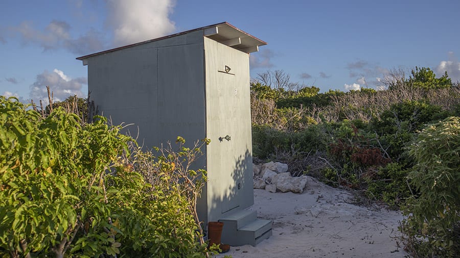 The toilet has its own cute little cabin with a boxed-in loo. Everything drops into the deep hole below to be dissolved.