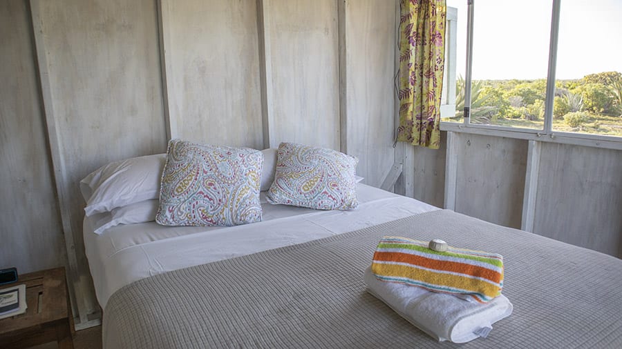 Cosy and an oasis of calm, the cabana at Frangipani Glamping, is the ideal place to switch off from modern life and have a digital detox. The cabana is rustic, painted pale blue on the outside and whitewashed on the inside.