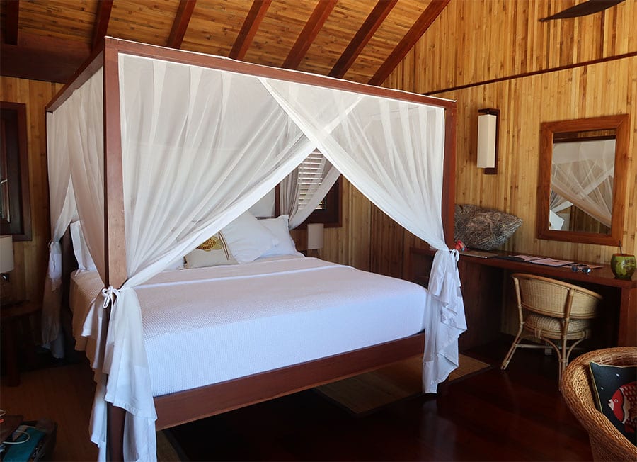 Each bungalow is elegant and simply decorated. A king-sized bed with crisp white linen and mosquito nets, chairs for chilling and taking in the view, tea and coffee making facilities and an ensuite bathroom with a large walk-in shower, L’Occitane toiletries all make it an inviting and relaxing place to be.