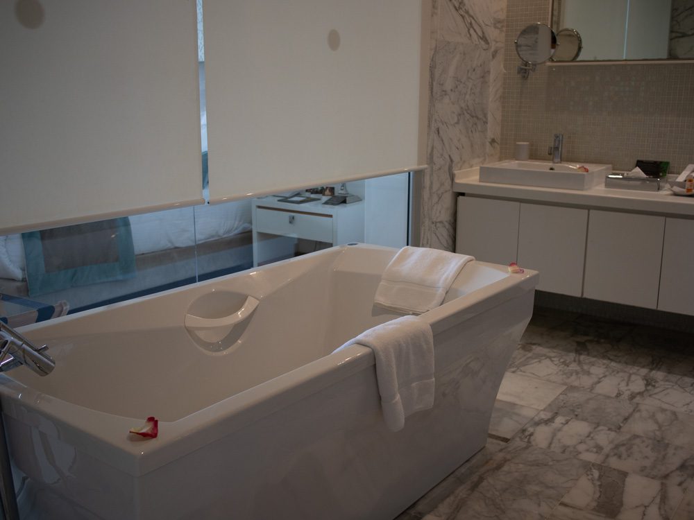 The bathroom has double sinks under a large mirror. A lovely large walk-in shower is to the right. If you love to have a bath, the freestanding one was deep, comfortable and filled very quickly. Next to it was a glass wall looking into the bedroom. If you are feeling modest, there are blinds that lower for privacy to anyone else in the suite.